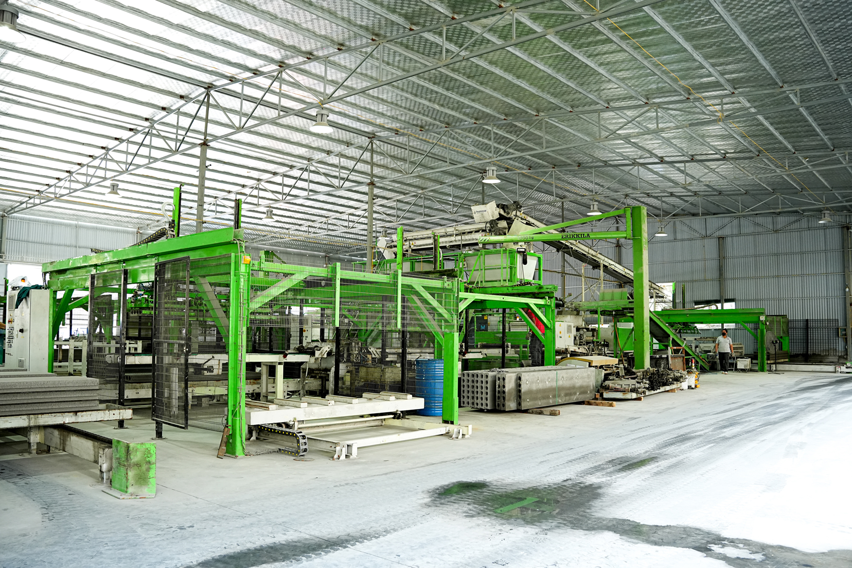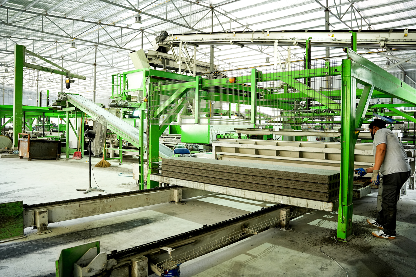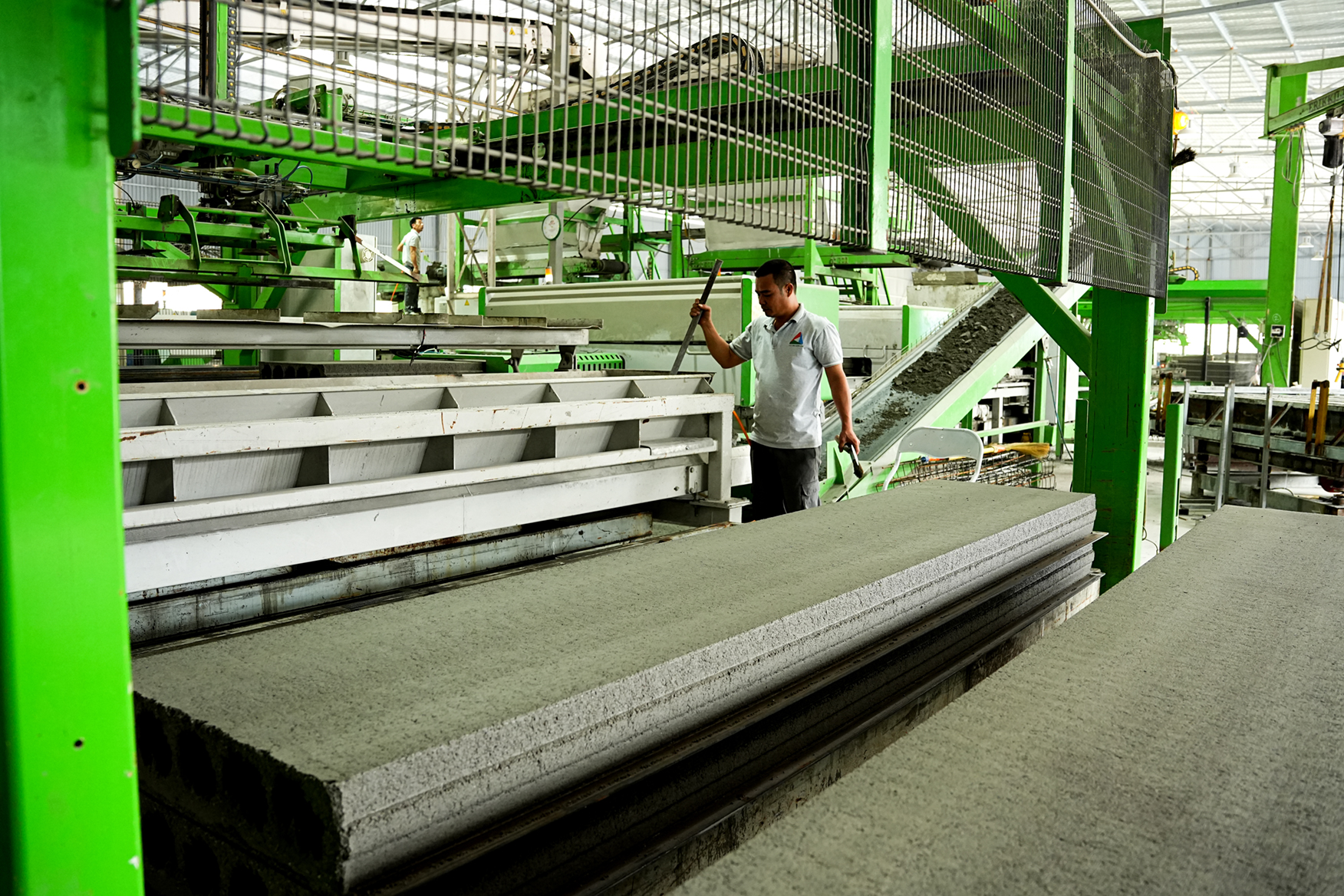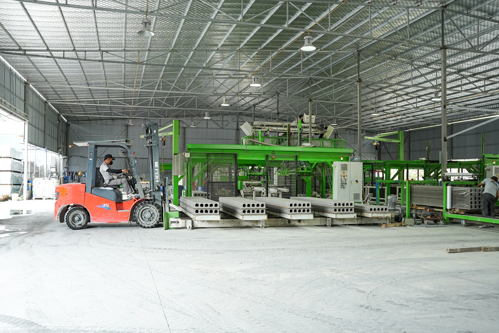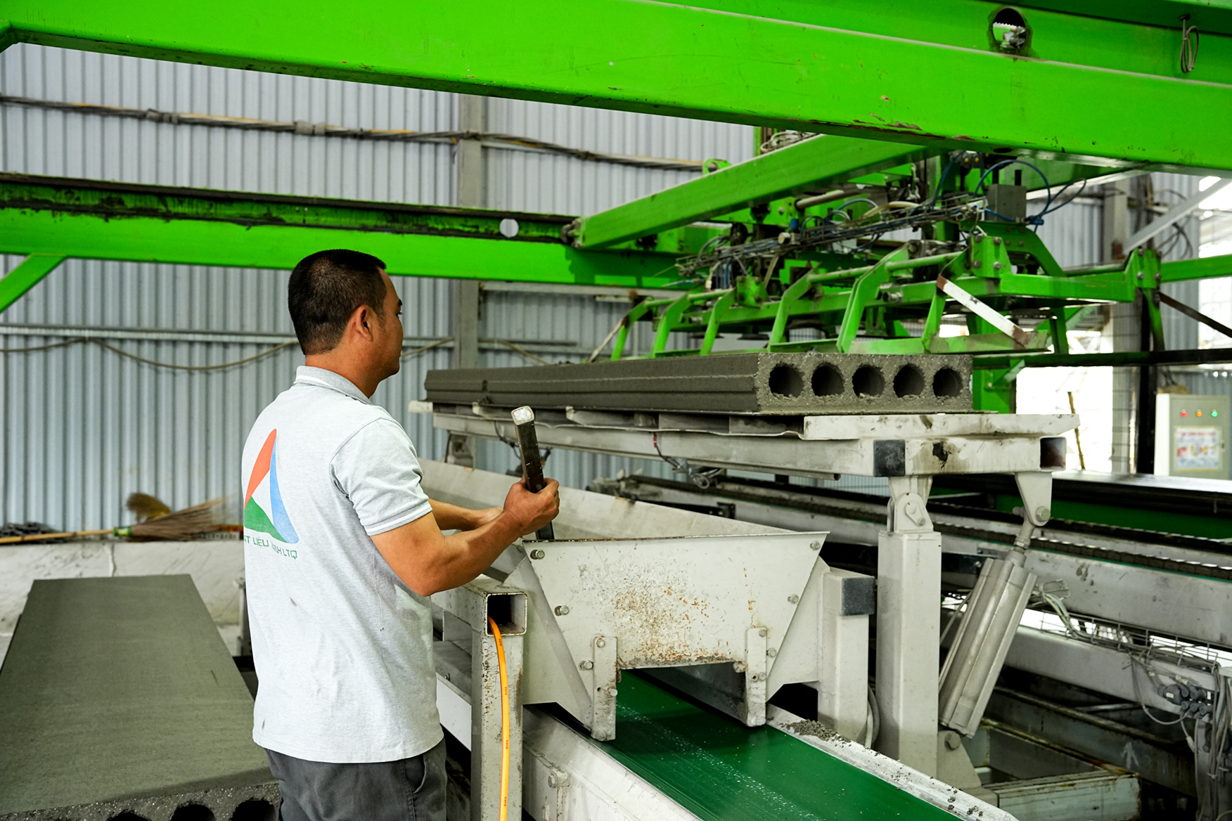 Dây chuyền sản xuất tấm tường Acotec sử dụng trạm trộn đồng bộ Frumecar (Tây Ban Nha) kết hợp công nghệ Elematic (Phần Lan) và sản xuất theo công nghệ đùn ép hiện đại